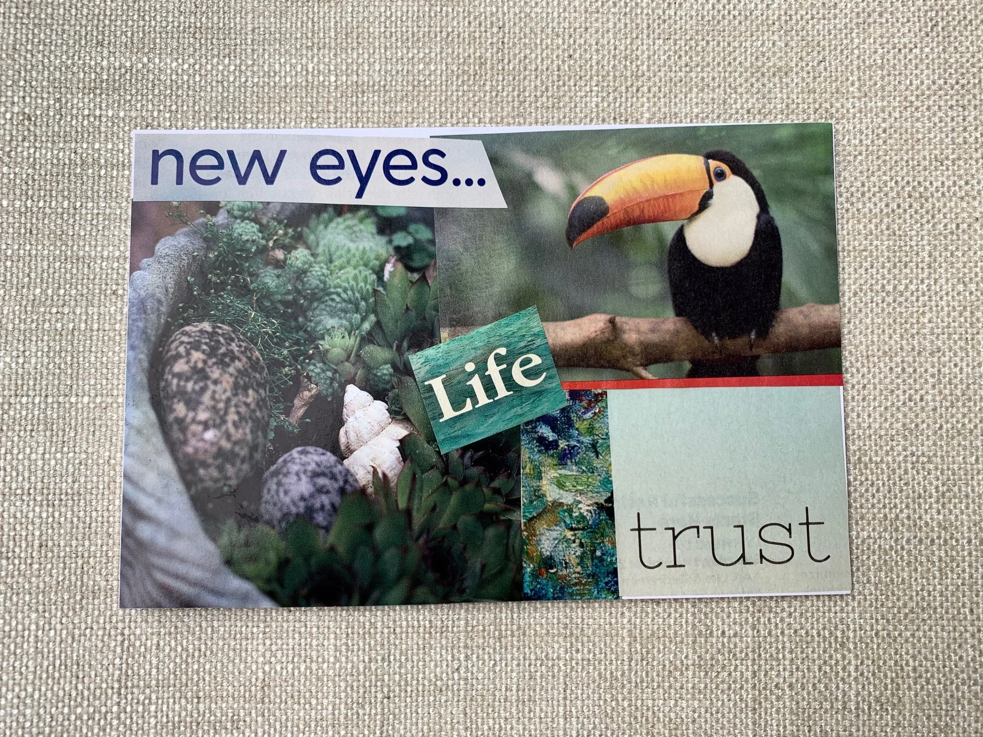 In the summer of 2020, when all of us were in lockdown, in one form or another from the pandemic, I embarked on a creative project to fill my days with something other than the alarming and depressing news that surrounded us. With a passion, I started cutting out images and words from the magazines I had laying around. I spent days doing this and found relief and joy in the concentrated task I had set for myself. I had recently made a collage postcard for my sister’s birthday, with positive messages and beautiful images tailored for her life. I loved the idea and wanted to create more of these with messages that anyone could relate to and possibly benefit from.